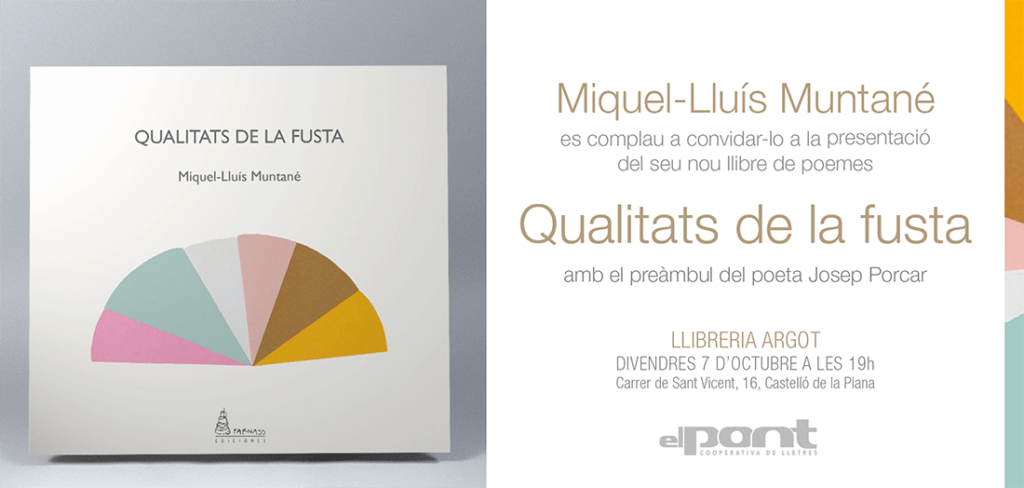 El poeta barceloní Miquel-Lluís Muntané presenta a Castelló la seua última obra poètica, Qualitats de la fusta (Parnass Ed., 2016). L’acte se celebrarà a la llibreria Argot el divendres 7 d’octubre, a les 19h, i comptarà amb el preàmbul del poeta castellonenc Josep Porcar.